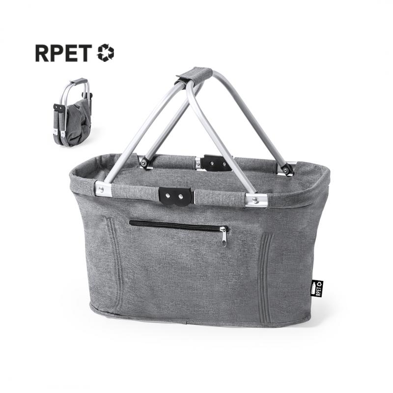 Cesta plegable fabricada en resistente 600D RPET. Con resistente estructura de aluminio y 2 asas de transporte plegables en aluminio, con cinta de velcro a juego. Bolsillo exterior con cierre de cremallera y etiqueta exterior con distintivo RPET. El material RPET se elabora a partir de plástico reciclado, para así fomentar la reutilización de residuos plásticos y ayudar a la sostenibilidad del planeta.