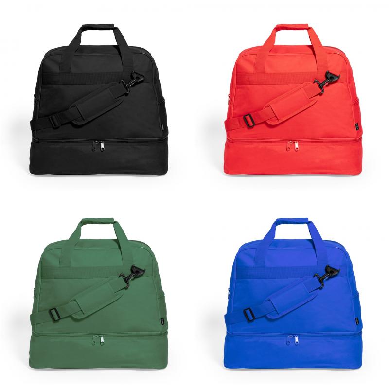 Bolso confeccionado en 600D RPET. Presenta tres compartimentos funcionales: un compartimento principal de gran capacidad con cierre de cremallera, una base con cierre de doble cremallera ideal para el calzado, y un bolsillo lateral de fácil acceso para objetos pequeños, con cierre de cremallera. Se encuentra disponible en una variada y viva gama de colores. Presentada individualmente en bolsa reciclada. El material RPET se elabora a partir de plástico reciclado, para así fomentar la reutilización de residuos plásticos y ayudar a la sostenibilidad del planeta.