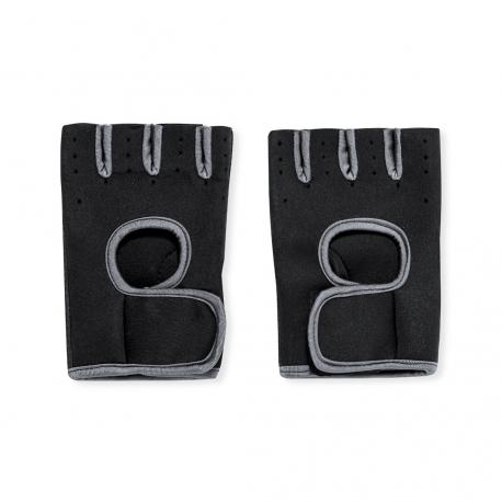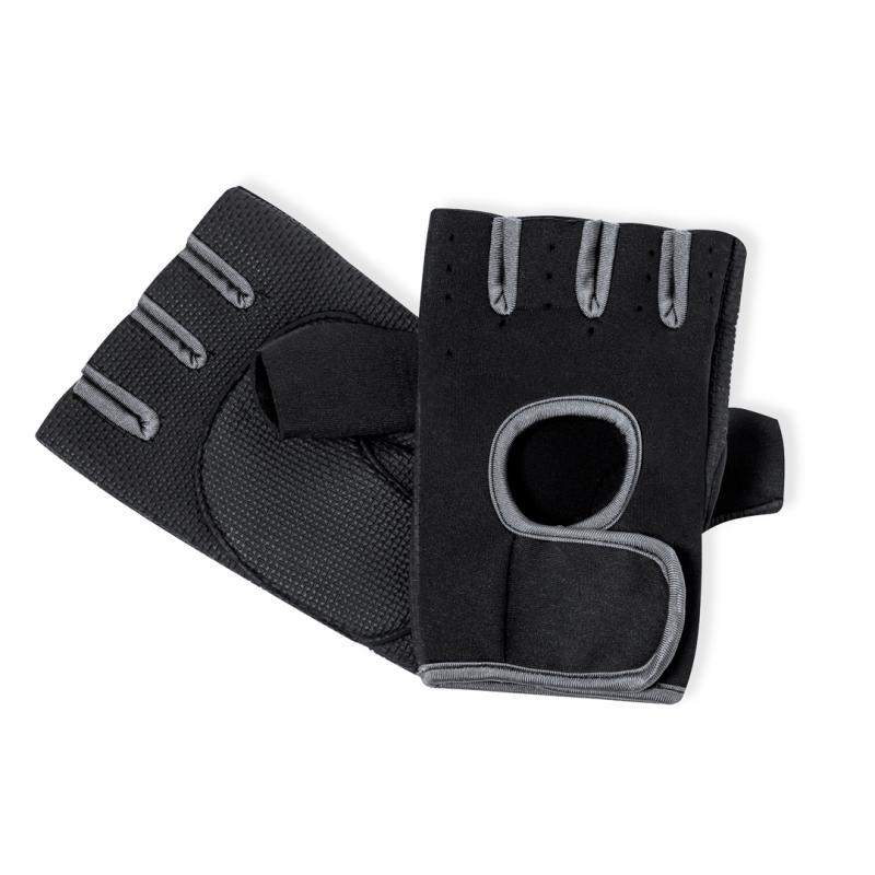 Guantes deportivos fabricados en suave poliéster y licra de neopreno, cuya combinación de tejidos crea una segunda piel que se adapta a la mano. cuentan con un cierre en la muñeca mediante velcro. Estos guantes son cómodos para cualquier disciplina gracias a su alta transpirabilidad, que se logra mediante el diseño de dedos al aire y los disipadores de calor en la parte superior, que además presentan un acabado rugoso para un óptimo agarre. Disponibles en color negro y con costuras en gris, en tallas S-M y L-XL. Presentados en una bolsa reciclada.