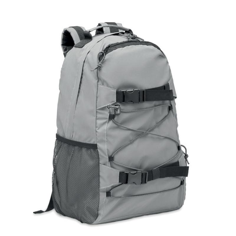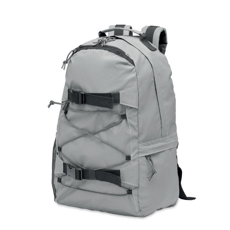 Mochila de poliéster 190T altamente reflectante con cordón en la parte delantera. Espalda, correas y fondo acolchados. Compartimento para portátil 15''. Un bolsillo lateral de malla y otro lateral con cremallera.Recipiente :