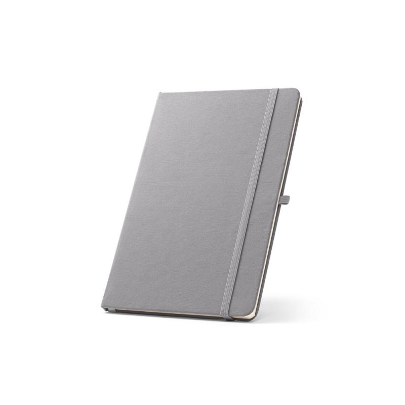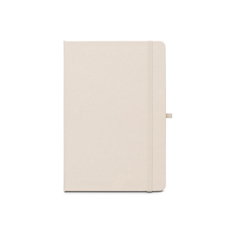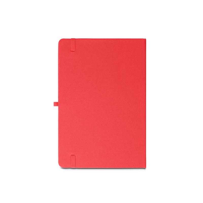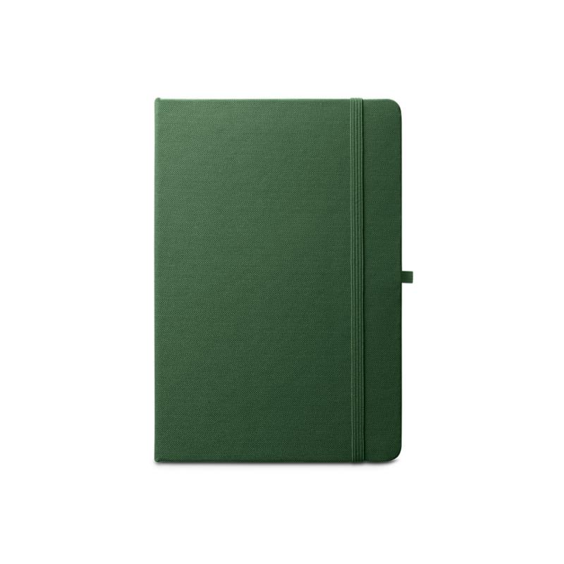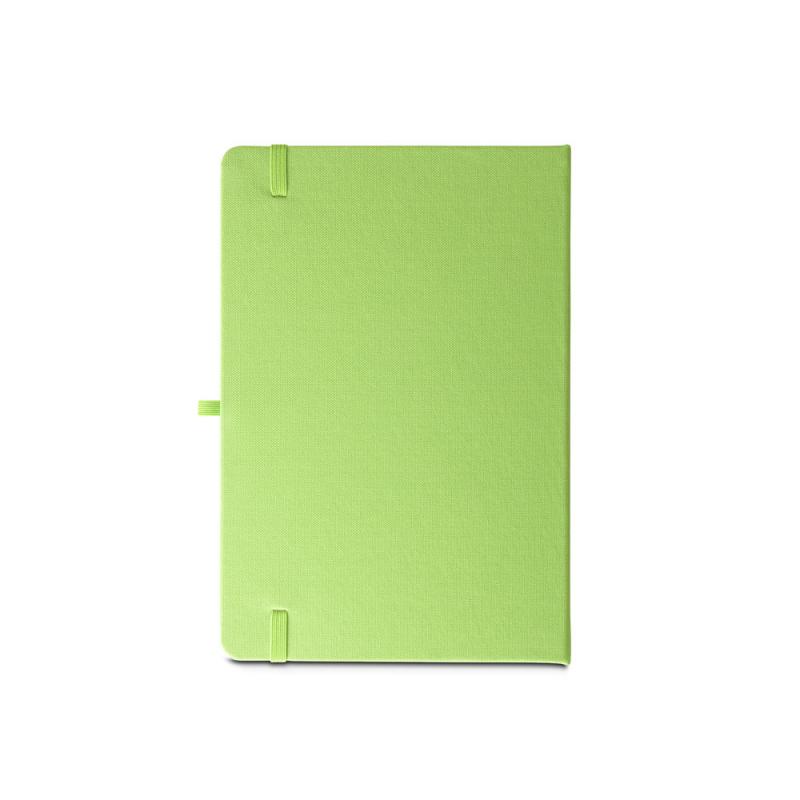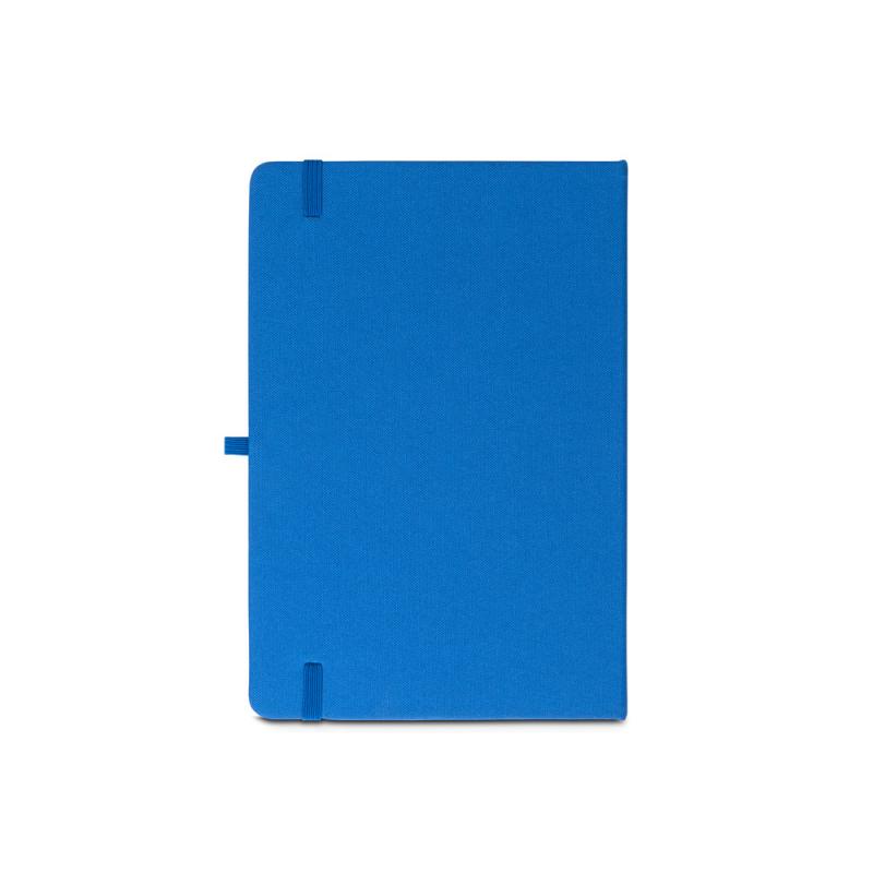 Libreta A5, con tapa rígida en poliéster reciclado (100% rPET) y esquinas redondeadas. Contiene 160 páginas rayadas en papel 100% reciclado color marfil, tira separadora, soporte para bolígrafo (no incluido) y goma elástica para cerrar. El símbolo rPET está impreso en blanco en la parte inferior del lomoRecipiente :