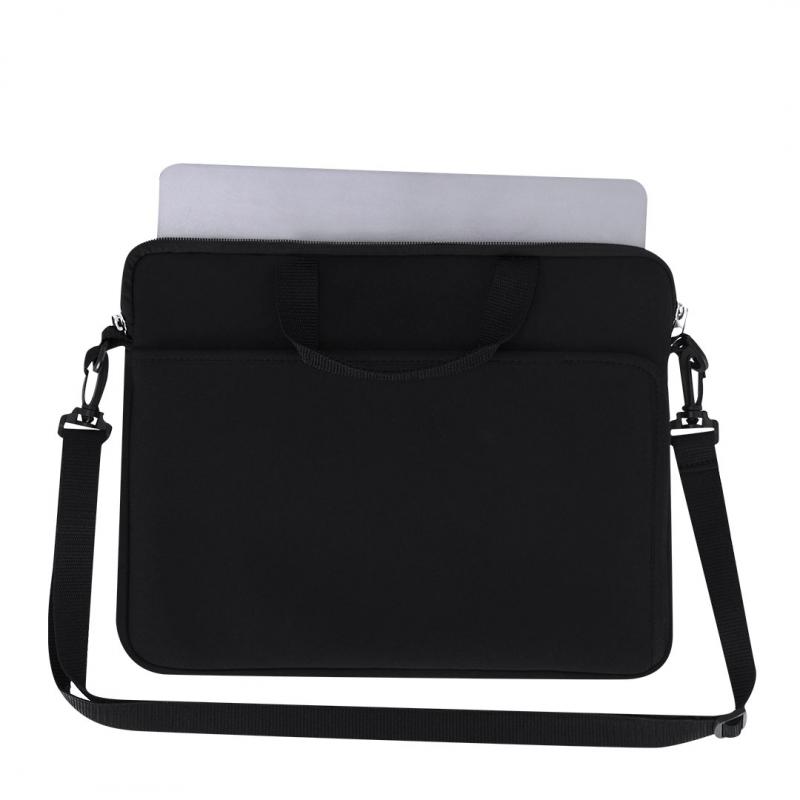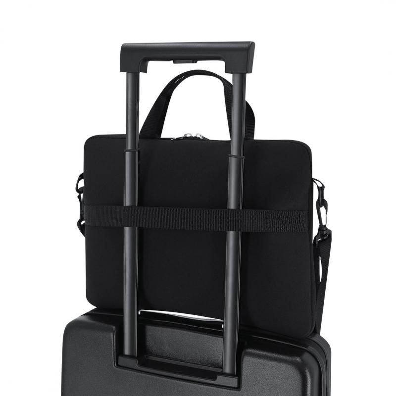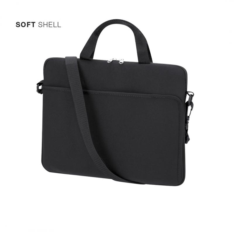 Funda para ordenador portátil confeccionada en soft shell, con compartimento principal acolchado para dispositivos de hasta 14 pulgadas. Diseñada con cierre de cremallera de doble tirador y un práctico bolsillo exterior de acceso rápido. Fácil de transportar gracias a sus asas de mano, cinta para hombro ajustable y cinta trasera para trolley.