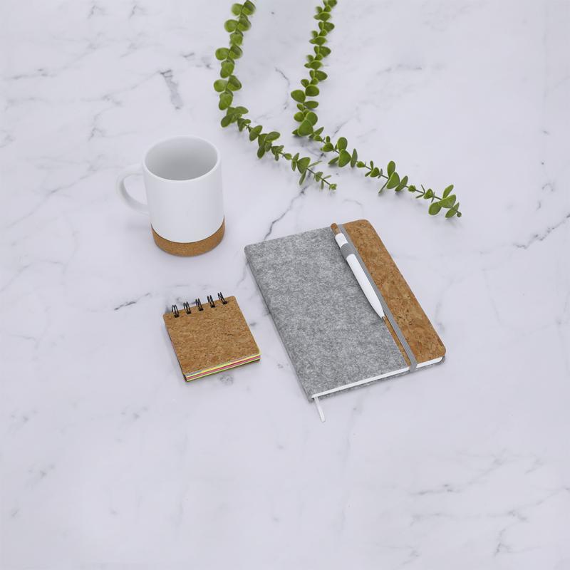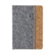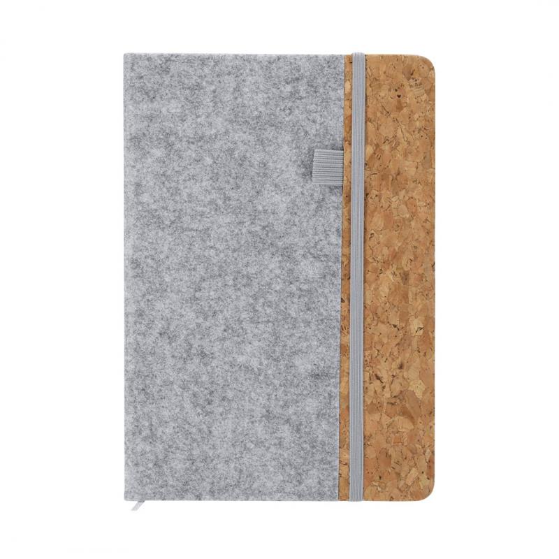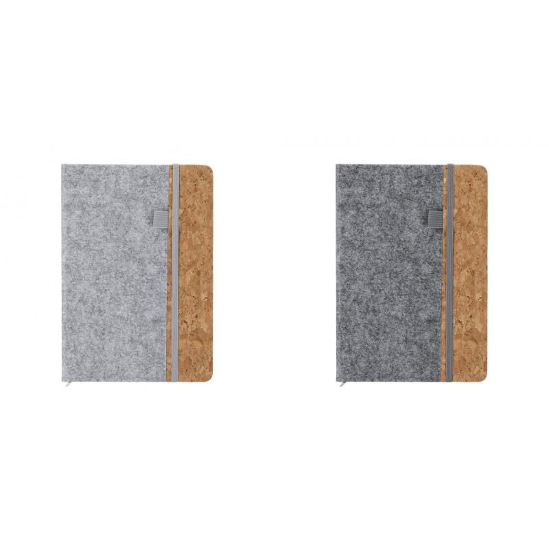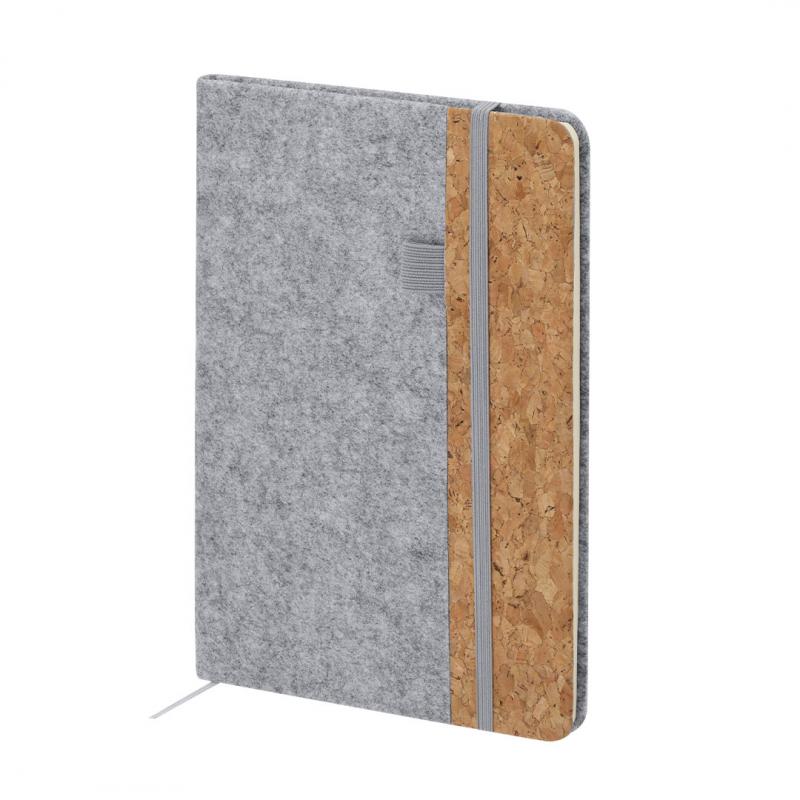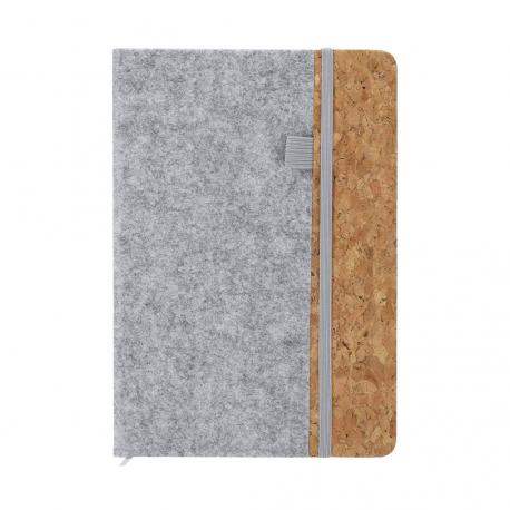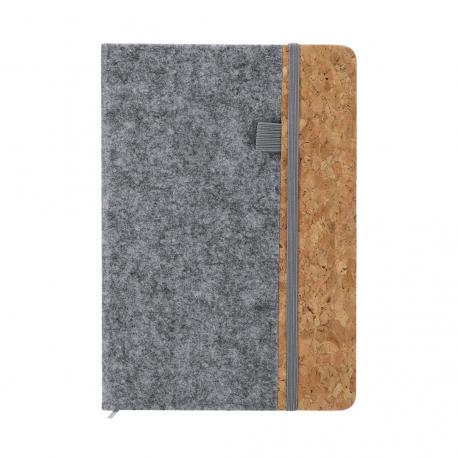Bloc de notas con tapas rígidas elaboradas en combinación de fieltro RPET y corcho. Incluye 80 hojas a una raya con elástico de sujeción para bolígrafos en portada, banda elástica de cierre y marcapáginas a juego. Incliye distintivo RFELT.Elaborado con elementos vegetales para así fomentar la utilización de materias primas naturales y reducir las emisiones contaminantes.El fieltro RPET es fruto de la combinación del proceso de reciclaje de materiales plásticos junto con la técnica milenaria de fabricación del fieltro, dando como resultado un material de eco-tendencia que, además de ser de origen reciclado, también se convierte en reciclable.