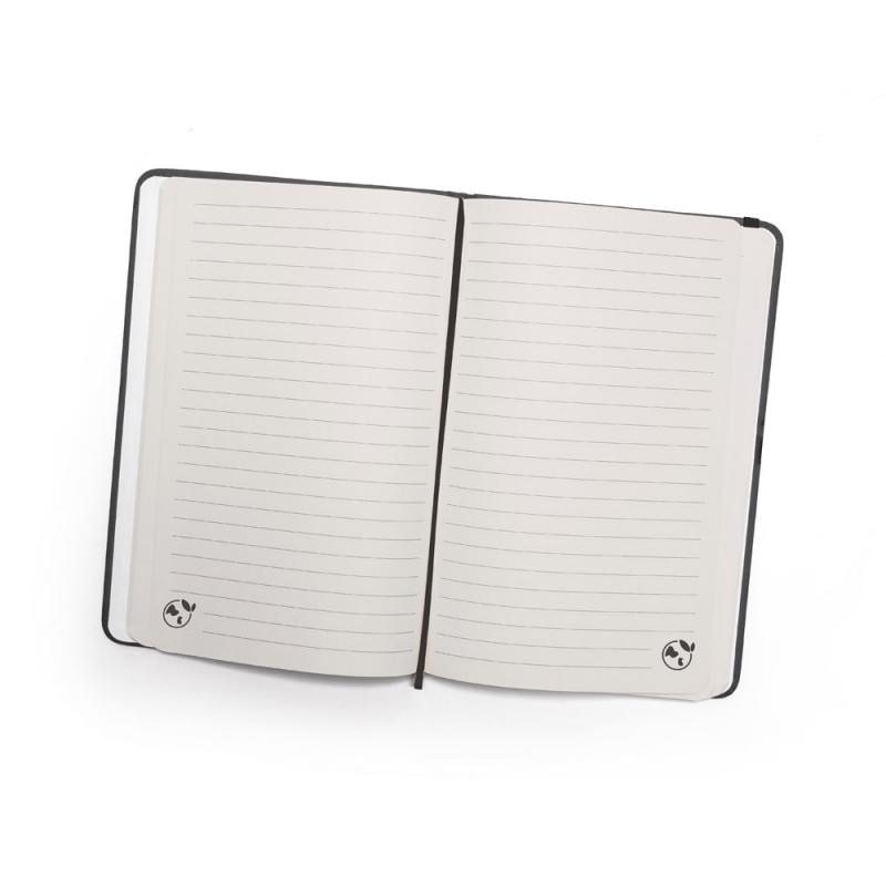 Bloc de notas A5 de PU reciclado "preconsumo" (35%) y PU (15%). La tapa dura está hecha de cartón 100% reciclado. Contiene 192 páginas de papel rayado, 100% reciclado, color marfil, tira separadora y goma elástica para cerrar la libretaRecipiente :