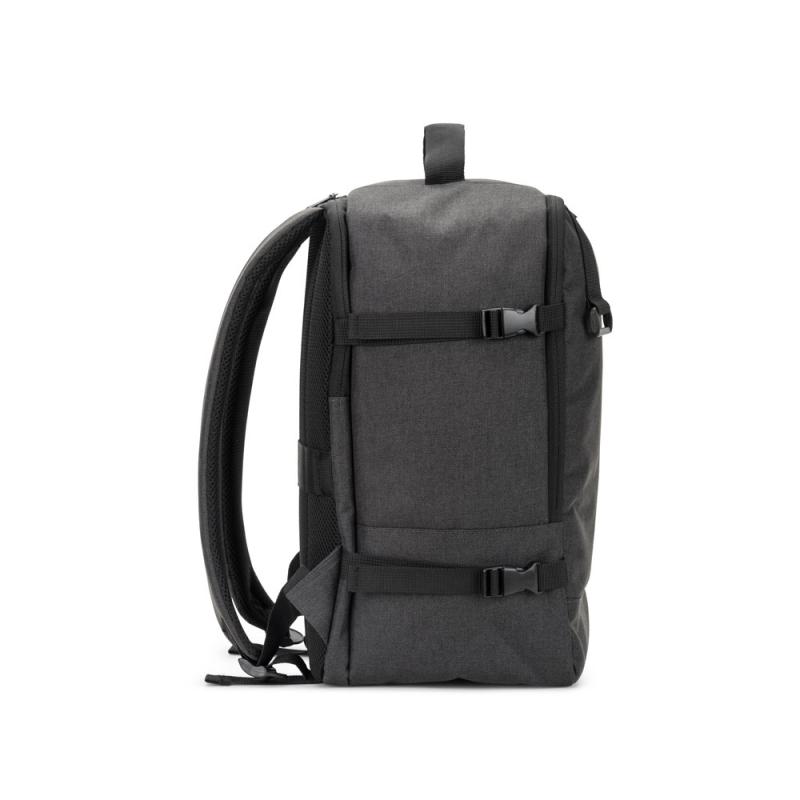Mochila diseñada para ajustarse a las medidas exigidas por las aerolíneas, ideal para viajar con todo lo que necesitas como equipaje de mano. Fabricada en poliéster reciclado 600D de alta densidad, con un revestimiento repelente al agua y forro interior de poliéster reciclado 210D. Cuenta con un compartimento principal amplio para la ropa, un compartimento totalmente acolchado para un portátil de hasta 14” y un bolsillo delantero. Ofrece mayor comodidad al viajar gracias a su asa superior acolchada, las correas de compresión laterales que permiten ajustar el tamaño según el contenido, y una espalda de malla con cinta para engancharla al trolley. En la parte frontal tiene una pieza para colgar objetos, como una botella con mosquetón. Capacidad de hasta 20 litrosRecipiente :
