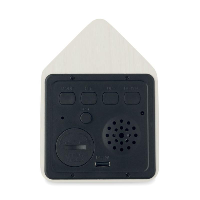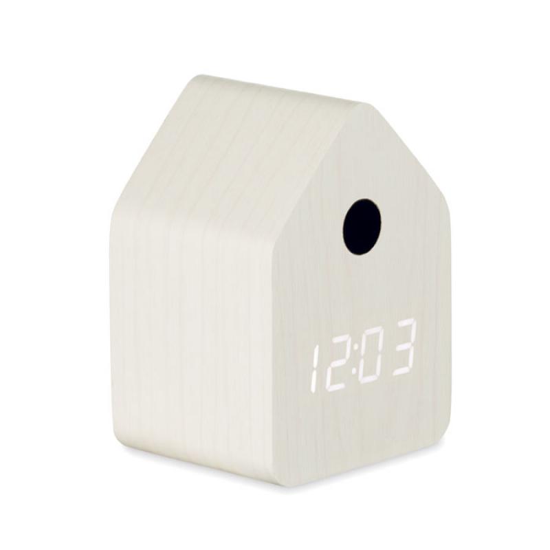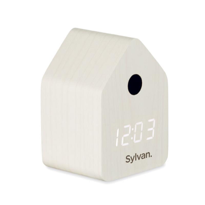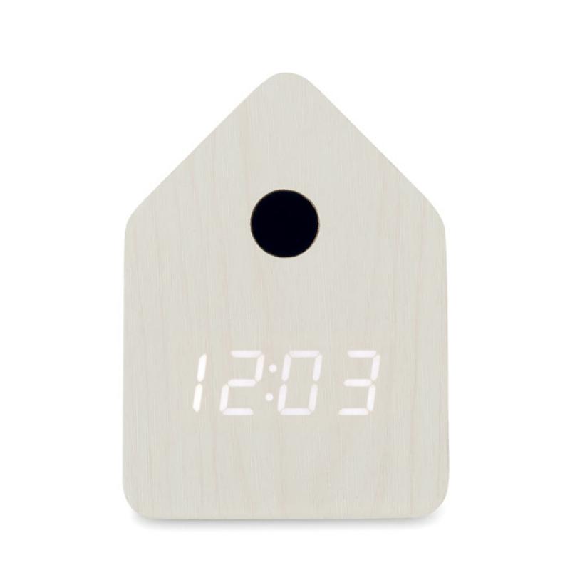 Pequeño reloj de sobremesa de MDF que incluye una alarma integrada con voz de pájaro cuco y visualización de la temperatura. Pantalla LED blanca. El sonido se silencia automáticamente entre las 22.00h y las 06.00h. intervalos de repetición de 5 minutosRecipiente :