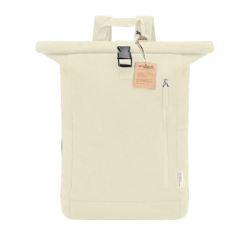 Mochila fabricada en material 100% canvas reciclado. Compartimento principal de gran capacidad con cierre de hebilla de seguridad y velcro, incluyendo un bolsillo frontal con cierre de cremallera invisible. Bolsillo lateral abierto de rápido acceso y asa superior. Con cintas para los hombros ajustables y etiqueta exterior con logotipo Algodón Reciclado.