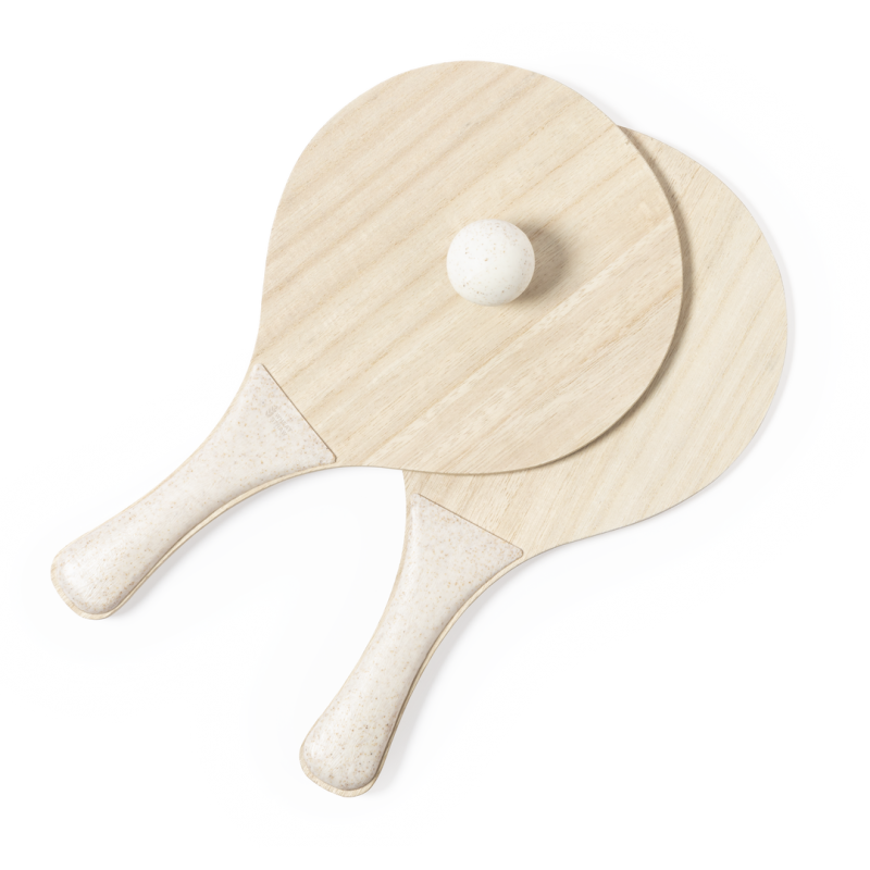 Par de palas de playa de línea nature. Fabricadas en madera, con mango reforzado en caña de trigo. Presentadas en bolsa de rejilla y con pelota de caña de trigo. Distintivo en el mango.