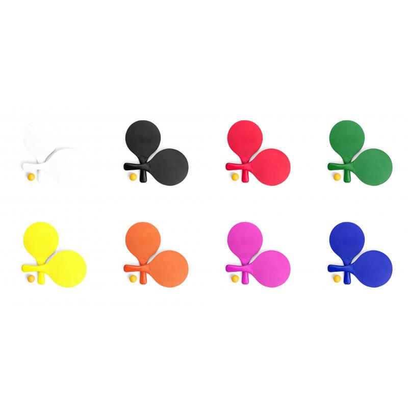 Par de palas de playa de alta calidad en madera natural de variada gama en vivos colores. Con mango reforzado a juego y presentadas en bolsa redecilla con pelota.