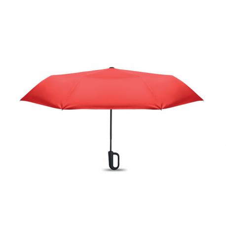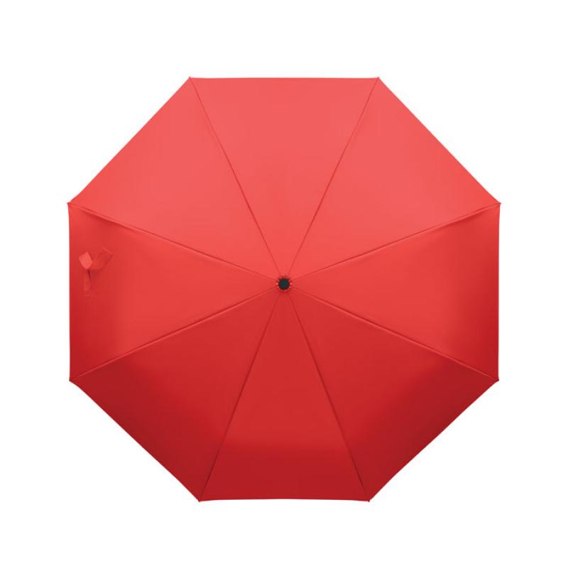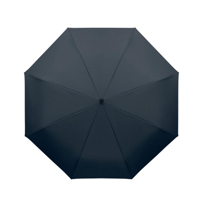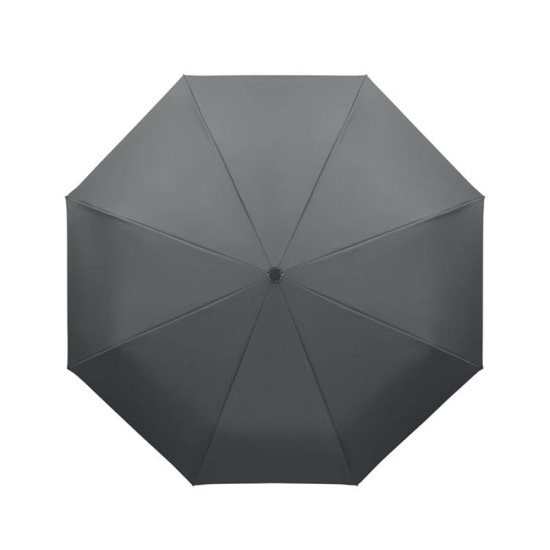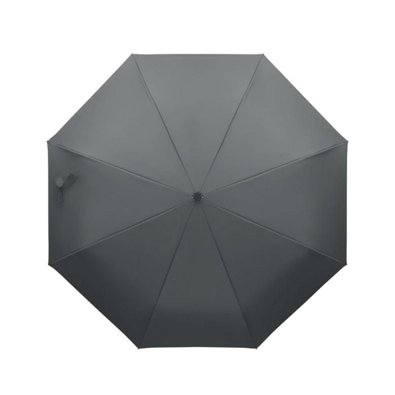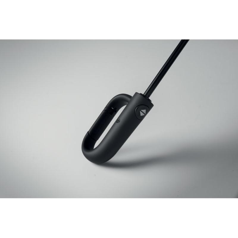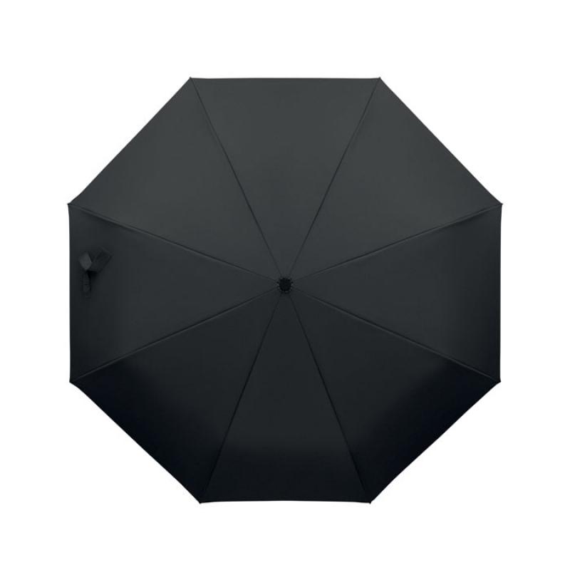 Paraguas antiviento plegable de 21'' con estructura de fibra de vidrio de 2 secciones totalmente chapada en negro. Costillas de fibra de vidrio. Paneles de RPET pongee 190T. Mango de mosquetón con acabado de goma. Apertura y cierre automáticos. Incluye fundaRecipiente :