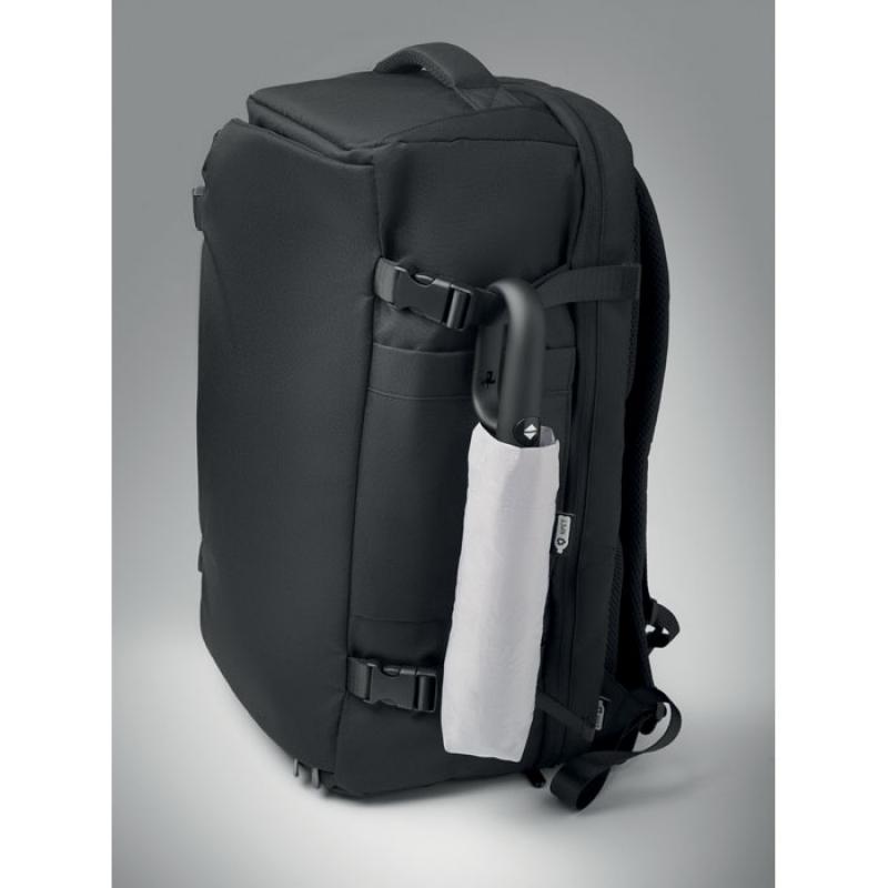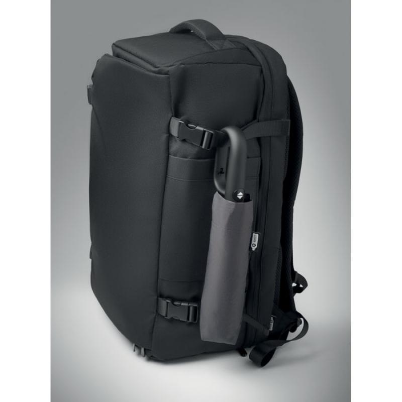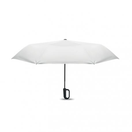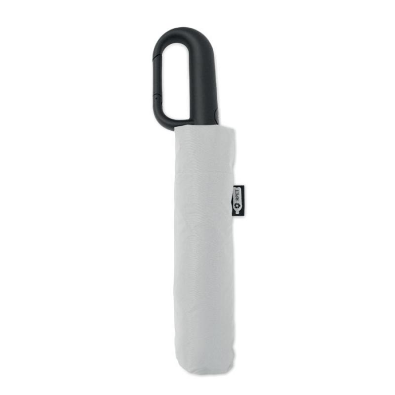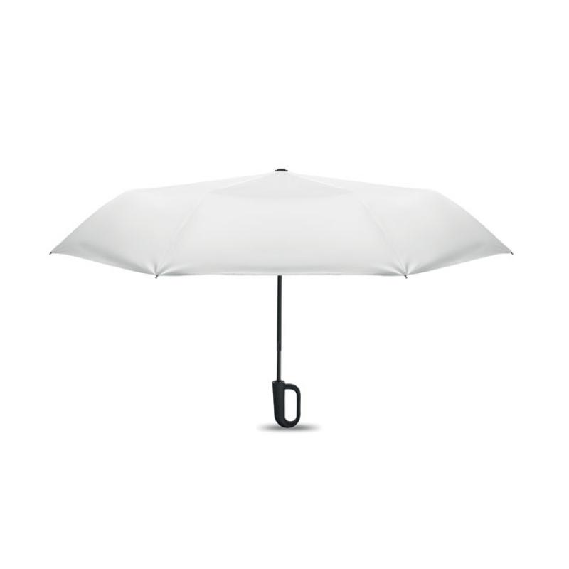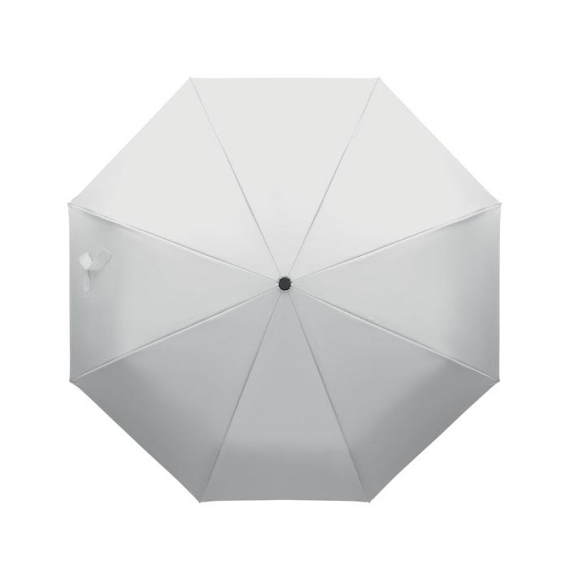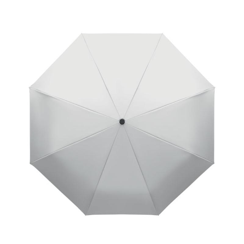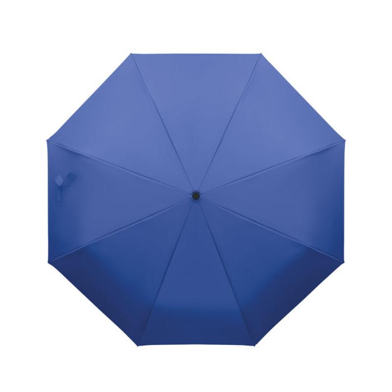Paraguas antiviento plegable de 21'' con estructura de fibra de vidrio de 2 secciones totalmente chapada en negro. Costillas de fibra de vidrio. Paneles de RPET pongee 190T. Mango de mosquetón con acabado de goma. Apertura y cierre automáticos. Incluye fundaRecipiente :