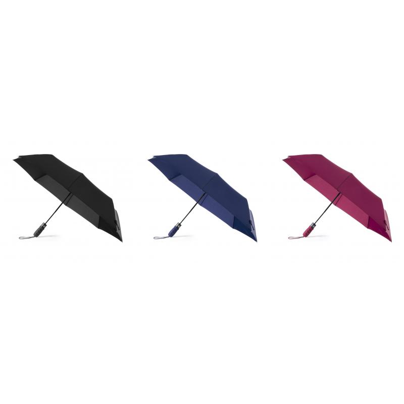 Paraguas plegable de alta calidad de 8 paneles en sobrios colores. De 98cm de diámetro, con apertura automática y en resistente material pongee. Con varillas metálicas en color negro, cierre de velcro y mango ergonómico de EVA con cinta de transporte. Presentado en funda individual a juego con cinta de transporte y cierre con accesorio de ajuste.