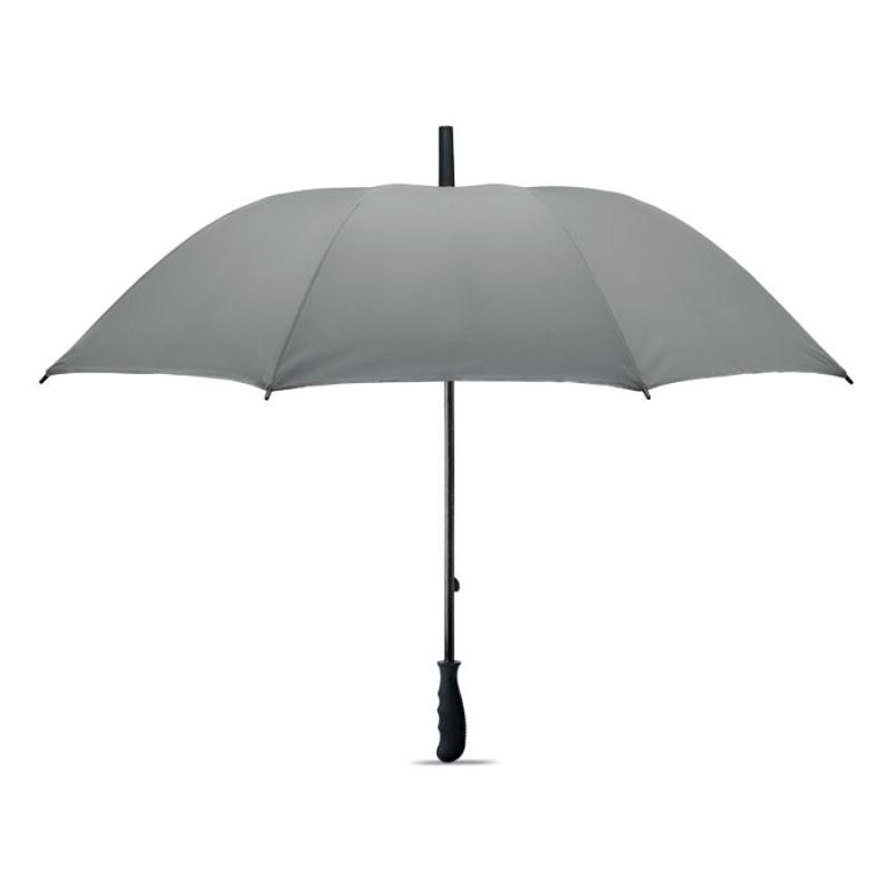Paraguas de 23'' de apertura manual en poliéster de altamente reflectante con eje y varillas de fibra de vidrio. Puntas y parte superior de plástico negro. Mango de goma negra.
