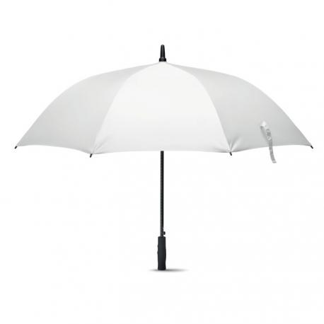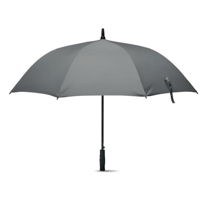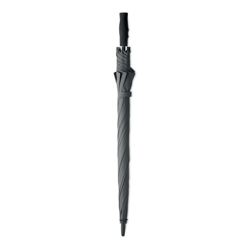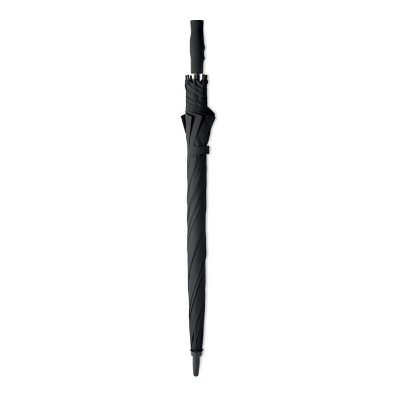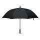 Paraguas de 27 inch con apertura manual, antiviento, con mango recto de ABS y acabado goma negro. Eje y costillas de fibra de vidrio, puntas de plastico. Pongee 190T. Cierre manual.