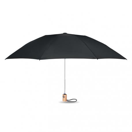 Paraguas de 23'. Apertura/cierre automático en pongee RPET 190T. Costillas de fibra de vidrio. Mango de bambú con correa de algodón para la muñeca. Incluye bolsa de RPET a juego.