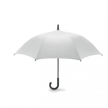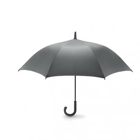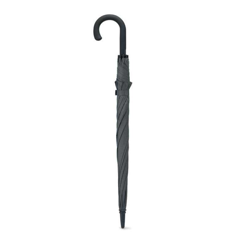 Paraguas anti-viento de apertura automática en material Pongee 190T con eje de metal lacado en negro, varillas de fibra de vidrio y puntas en plástico negro. Mango curvo en ABS con acabado caucho negro y pulsador gris.