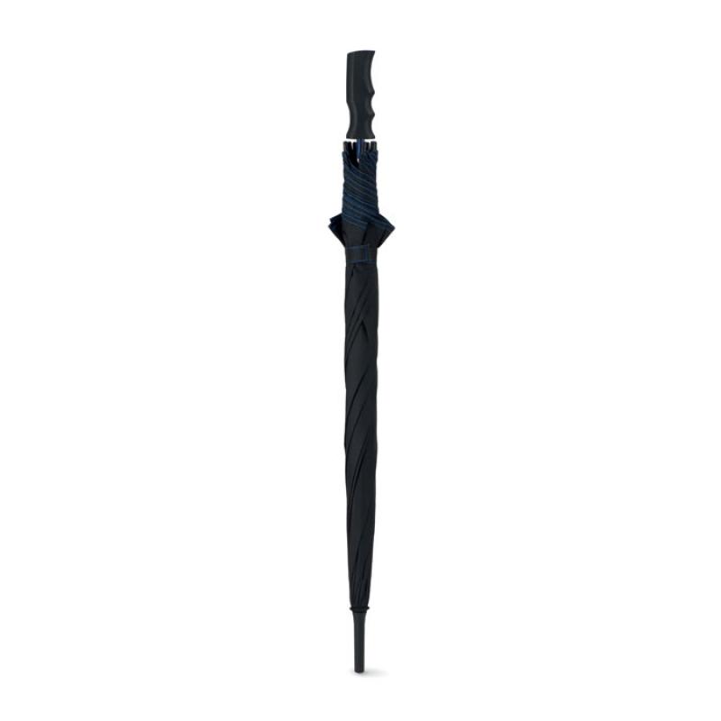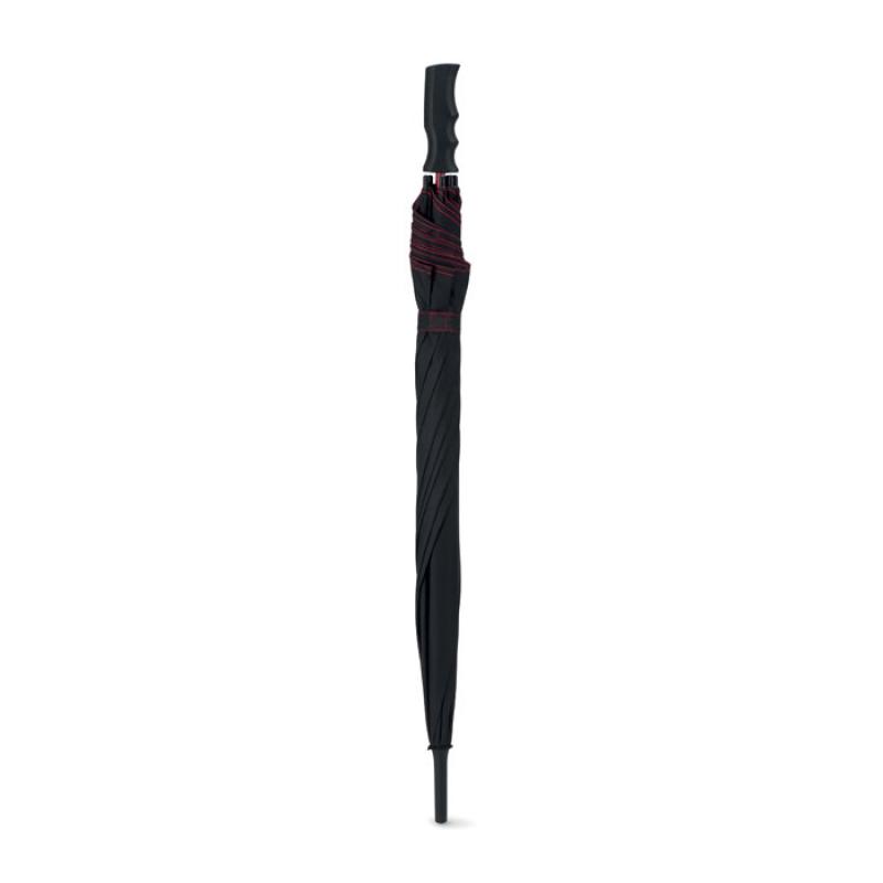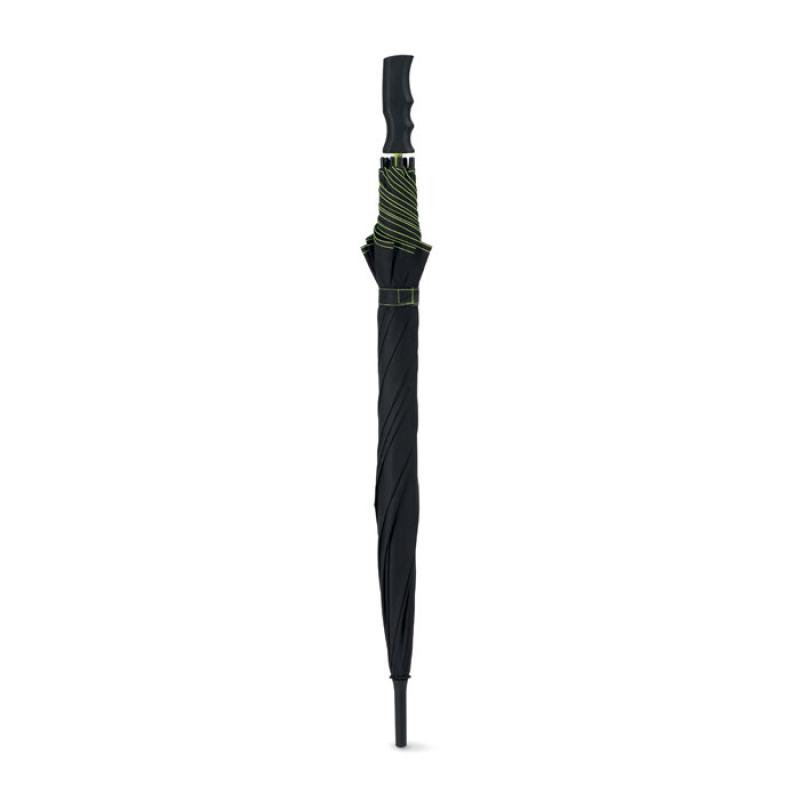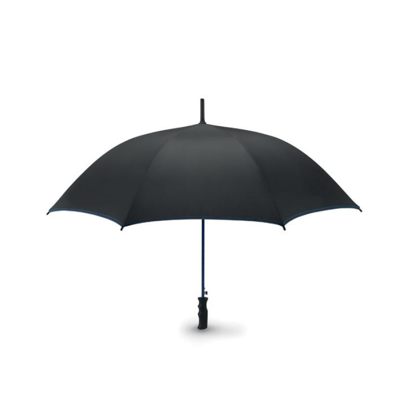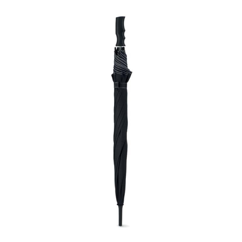 Paraguas para tormenta de apertura automática en pongis 190T con caña y costillas en fibra de vidrio y puntas de plástico negro. Paneles en negro puntadas a juego. Mango en plástico negro liso.