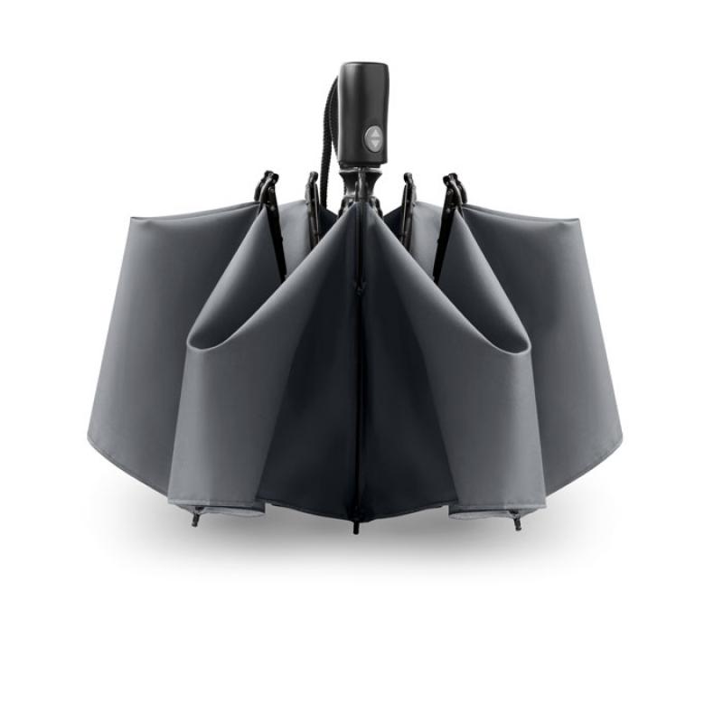 Paraguas plegable de 23'' apertura y cierre automático y reversible en 190T en pongee eje cromado chapado. Costillas en fibra de vidrio de costilla y 1 parte negro chapado en el interior del marco. Mango de ABS negro con pulsador. Incluye funda a juego.