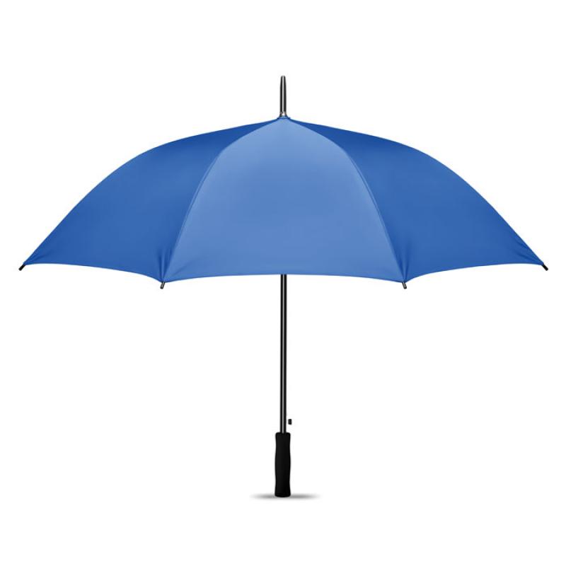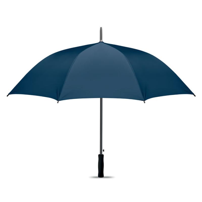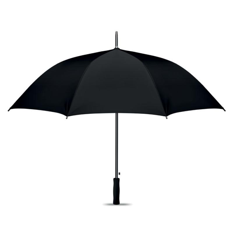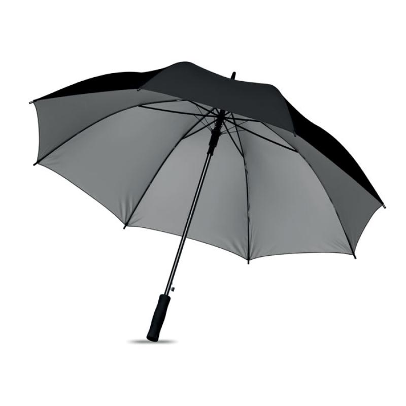 Paraguas de 27 ''apertura automática en material de poliéster 190T y recubrimiento en plata interior. Eje y varillas en chapado metálico negro. Puntas de plástico negro y mango EVA negro recto. Cierre manual.