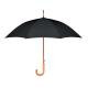 Paraguas apertura automática de 23'' de pongee 190T RPET con eje, puntas y parte superior de madera. Varillas en chapado metálico negro. Mango de madera curvado con acabado natural. Cierre manual.
