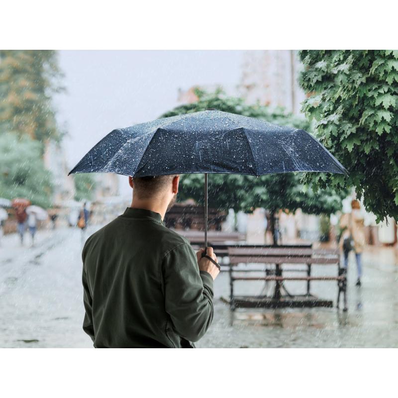 Paraguas de "pongee" rPET 190T, con varillas de fibra de vidrio y mango de PP. Paraguas plegable en 3 secciones con apertura automática y cortavientos. Suministrado en bolsa. Sombrilla: ø990 x 290 mm | Bolsa: ø55 x 240 mm