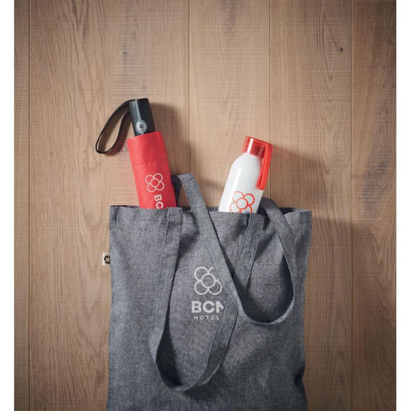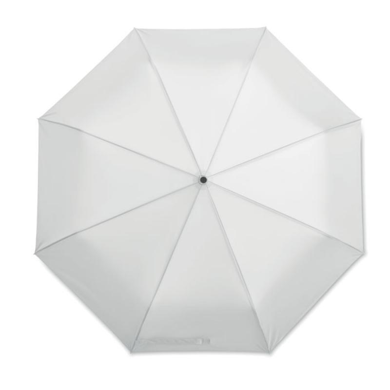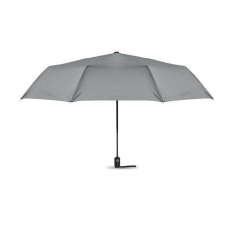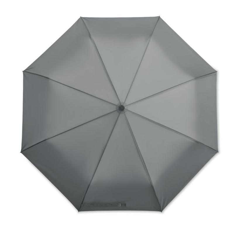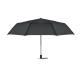 Paraguas plegable de 27'' con apertura y cierre automático de pongee 190T. Anti viento. Eje de acero chapado negro. Varillas de fibra de vidrio. Mango de PP negro con pulsador. Con bolsa a juego.