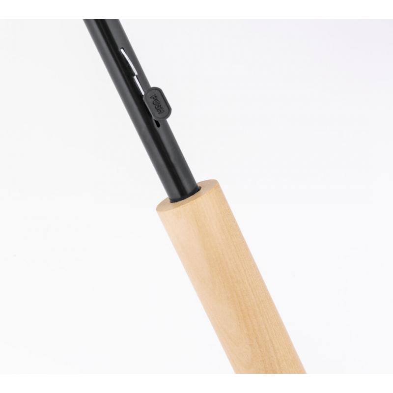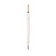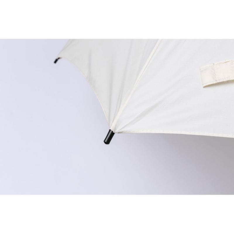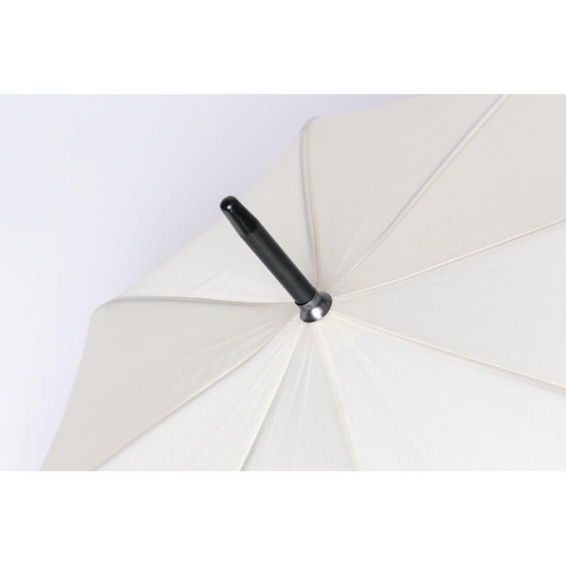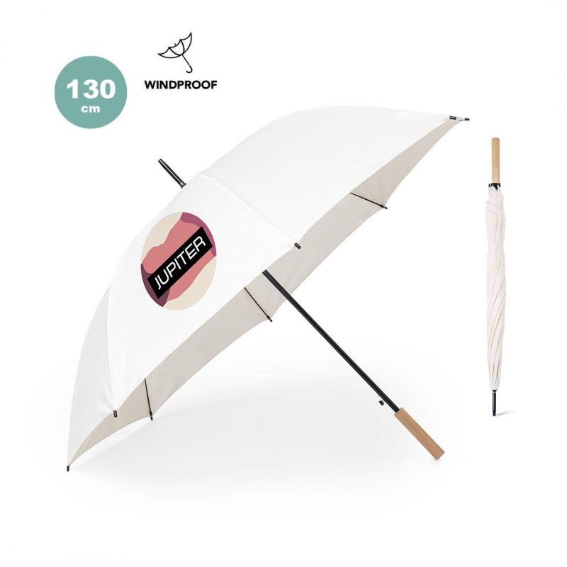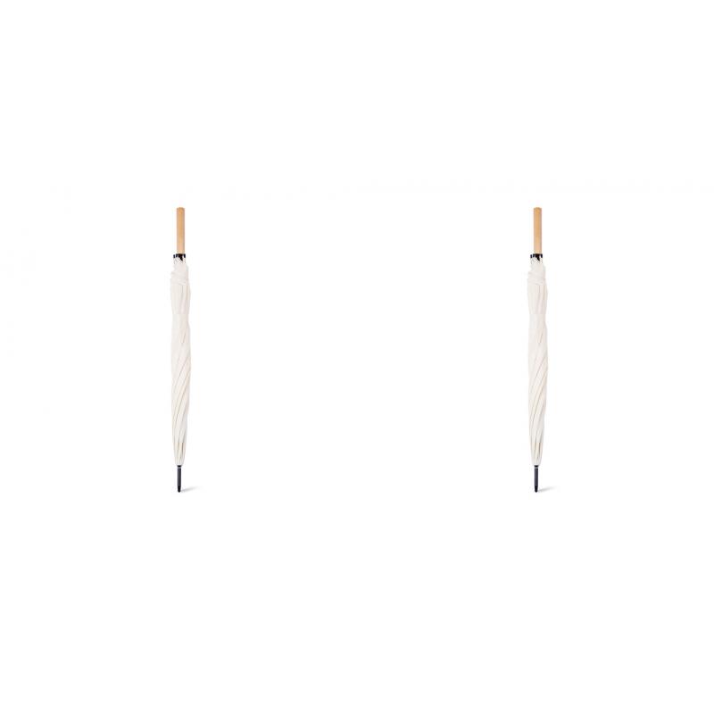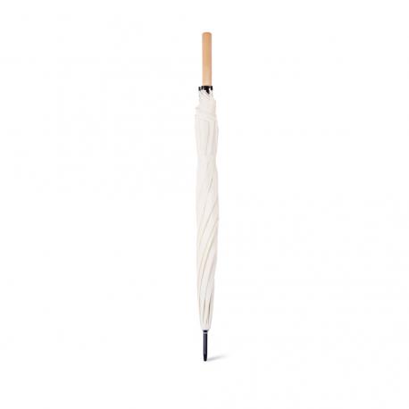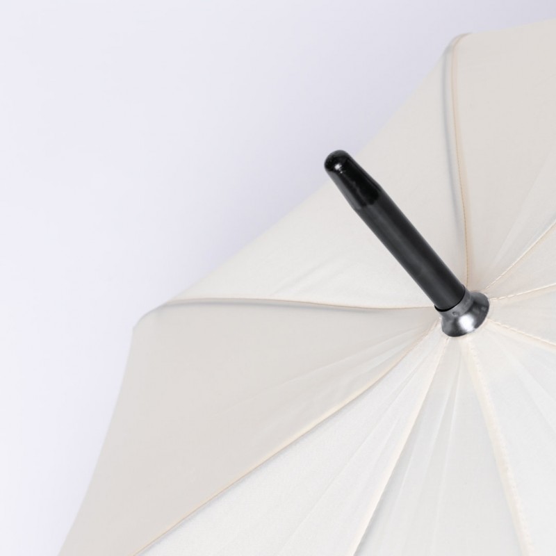 Paraguas de 8 paneles tamaño XL -130 cm diámetro-, fabricado en resistente material pongee 190T de acabado natural. De apertura automática y con mecanismo antiviento. Varillas de fibra en color negro, con mango recto de madera y cierre de velcro