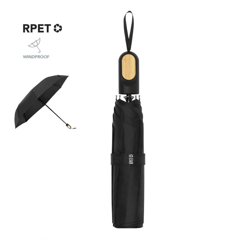 Paraguas plegable de 97cm de diámetro. En material pongee 190T RPET. De apertura manual, con sistema anti viento y varillas fabricadas en fibra de vidrio. Mango ergonómico con elegante detalle en bambú, fácil transporte gracias a su cordón, funda y cierre con velcro a juego. Con etiqueta distintiva RPET. Presentado en bolsa individual reciclada.El material RPET se elabora a partir de plástico reciclado, para así fomentar la reutilización de residuos plásticos y ayudar a la sostenibilidad del planeta.