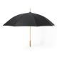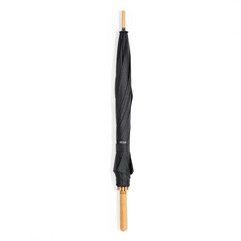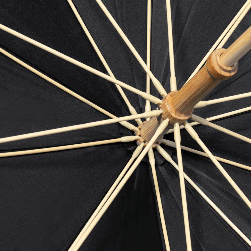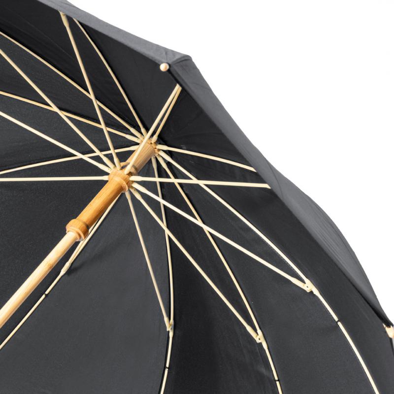 Paraguas de 140cm de diámetro en material pongee 190T RPET. Apertura manual y varillas de fibra de vidrio antiviento, de elegante color negro con cierre de velcro. Mango recto hecho en bambú y etiqueta distintiva RPET.El material RPET se elabora a partir de plástico reciclado, para así fomentar la reutilización de residuos plásticos y ayudar a la sostenibilidad del planeta.