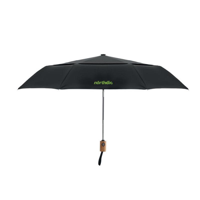 Paraguas 21'' anti viento de 2 pliegues, de poli algodón 190T (70% poliéster y 30% algodón), con eje y puntas de aluminio y mango de bambú. Varillas de fibra de vidrio negra. Incluye funda a juego. Cierre automático.Recipiente :