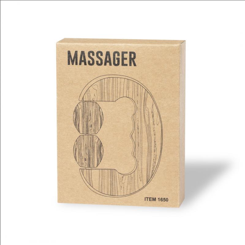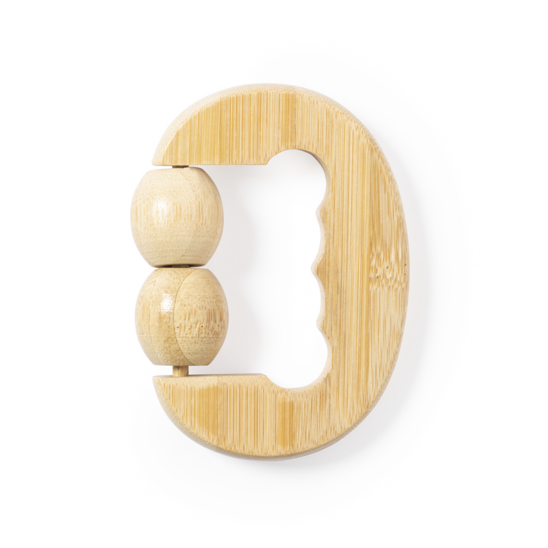 Masajeador de línea nature, fabricado en en bambú. Con 2 bolitas masajeadoras a juego y asa ergonomica. Presentación en caja individual de diseño kraft.