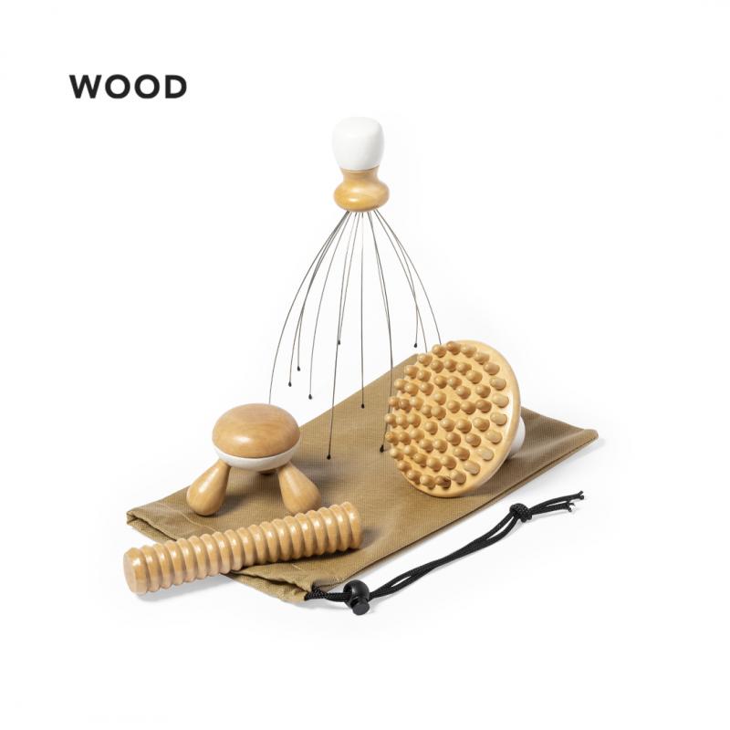 Set de masaje fabricado en madera natural. Contenido: Masajeador con mango en madera natural y patas metálicas, con suaves terminaciones de goma y efecto más que relajante.Masajeador cilindro para pies.Masajeador para espalda con 3 patas.Masajeador con multitud de puntos de masaje.Bolsa a juego, con cierre de cordón y bola de ajuste. Presentación en caja individual de diseño kraft.