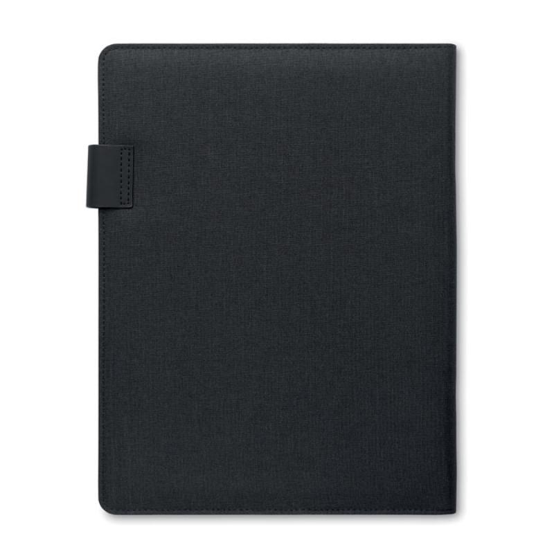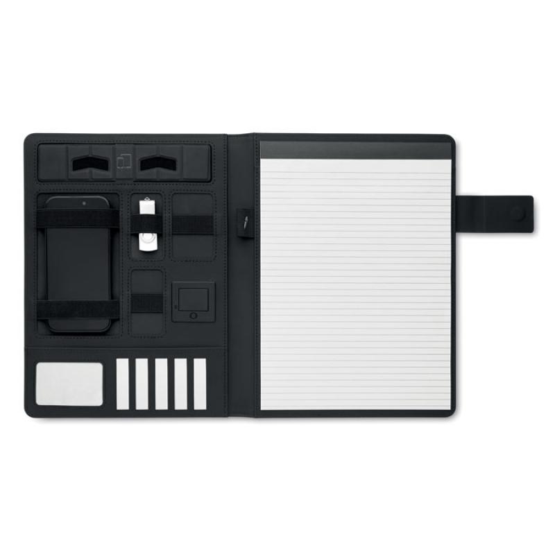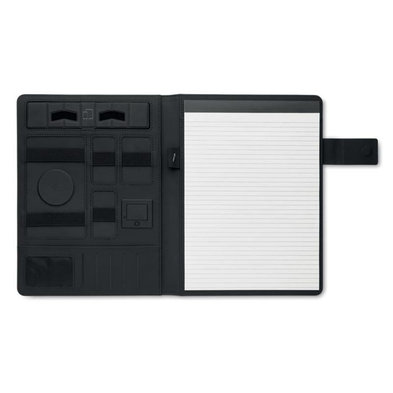 Portadocumentos A4 con funda de lino-PU. Power bank de 5000 mAh y cargador inalámbrico magnético de 15W. Bloc de notas de 20 hojas rayadas. Múltiples compartimentos internos. Cierre magnético. Portabolígrafos elástico.Recipiente :
