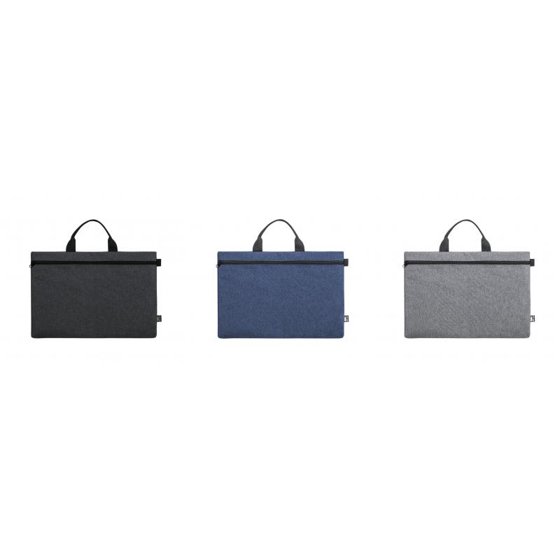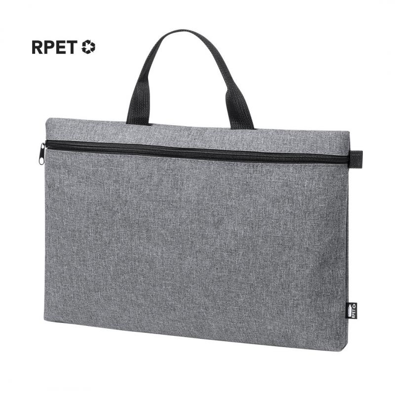 Portadocumentos de línea nature y en resistente 600D RPET efecto melange, elaborado a partir de plástico reciclado para así fomentar la reutilización de residuos plásticos y contribuir a la sostenibilidad del planeta. Detalles en negro y compartimento principal con cierre de cremallera. Resistentes asas a juego y distintivo RPET en etiqueta exterior.