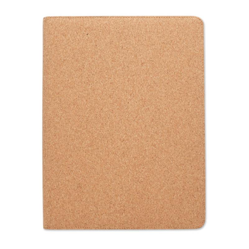 Porta doucmentos A4 de corcho. Bloc de notas A4. 30 hojas rayadas de papel reciclado. Bolígrafo y portabolígrafos a juego. 2 compartimiento para tarjetas y un compartimento grande.Recipiente :