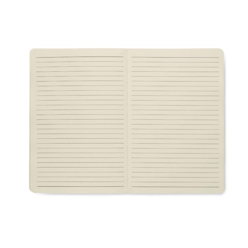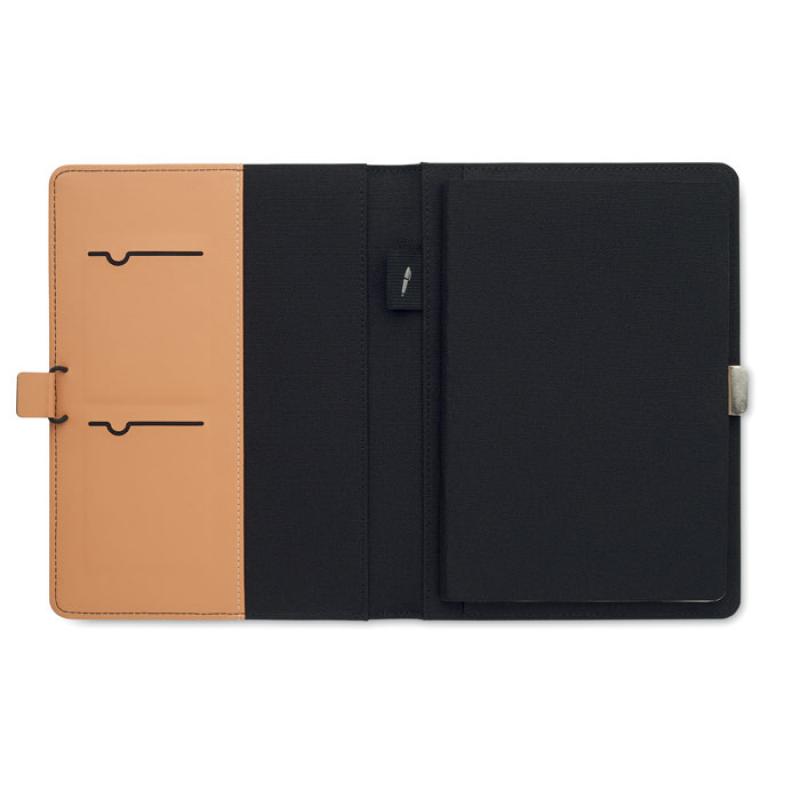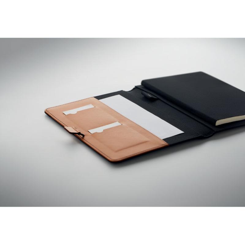Portadocumentos A5 en RPET con detalles de piel sintética. Libreta A5 recargable con tapa de corcho duro. Encuadernado. 128 pág. rayadas de papel reciclado (64 hojas). Portabolígrafos. 2 tarjeteros y un compartimento grande. Cierre elástico con detalle metálico.Recipiente :