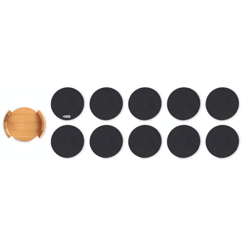 Set de 10 posavasos de fieltro RPET presentados en un soporte de bambú.