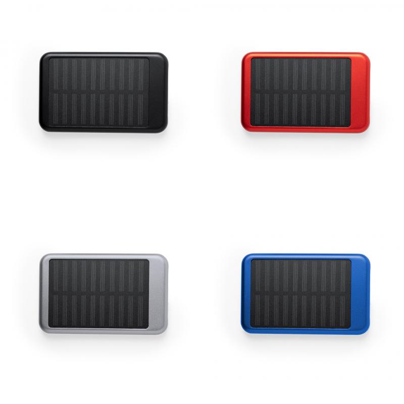 Batería auxiliar externa de recarga solar y de gran capacidad de carga -4.000 mAh-. En resistente aluminio, con salida USB y cable micro USB incluido. Disponible en variada gama de colores. Las capacidades mostradas en todas nuestras baterías auxiliares externas son reales, incorporando todas ellas baterías de grado A y no recicladas, con una vida útil de al menos 500 ciclos de carga y según normativa CE. Además, están fabricadas conforme a los estándares RoHS y en cumplimiento con los siguientes requisitos de seguridad: Sistema de protección contra sobrecarga del power bank. Sistema de protección contra descarga completa que proporciona una mayor durabilidad del power bank. Sistema de bloqueo para evitar cortocircuitos. Sistema de transferencia de carga constante, acorde con la capacidad del dispositivo de destino.