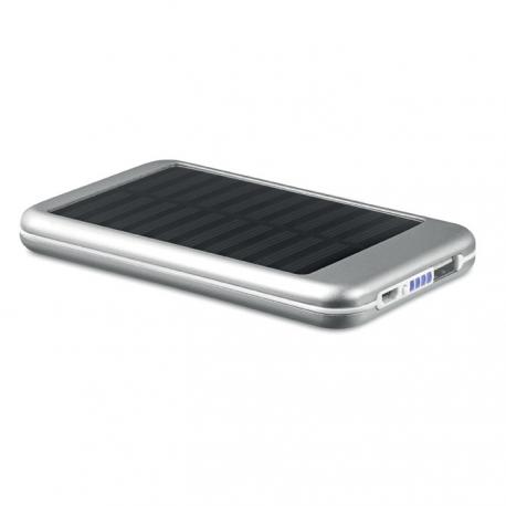 Powerbank solar de aluminio de 4000 mAh. Compatible con smartphones. Output DC5V/1A. Incluye indicador de luz de carga y cable USB con conexión micro USB. La carga por luz solar está orientada para uso en caso de emergencia. La carga solar es menos eficiente que la carga por cable USB.