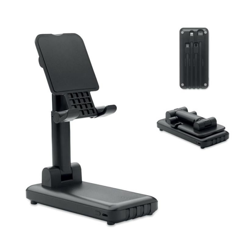 Power bank 10000 mAh en ABS con soporte para teléfono extensible y plegable. Múltiples cables integrados. Salida: DC 5V/2A.