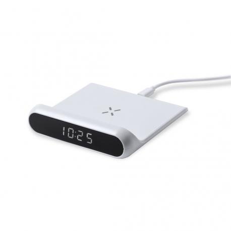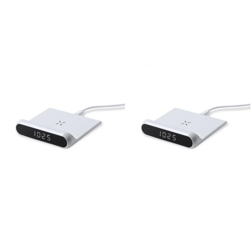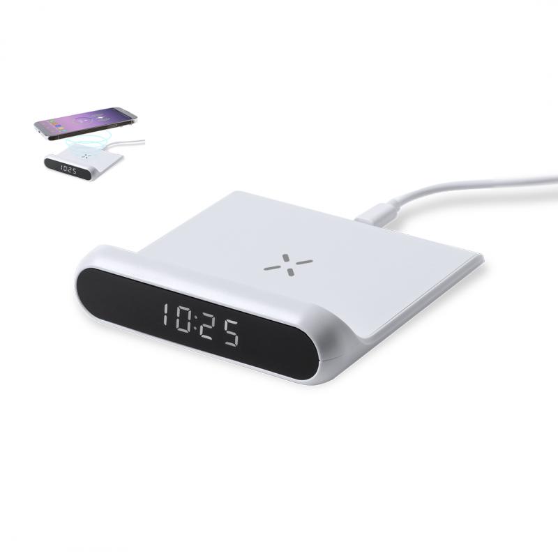 Reloj multifunción con pantalla retroiluminada y cargador inalámbrico 10W integrado. De elegante diseño en color blanco, con funciones hora y alarma. Cable de carga Tipo C de 1 m incluido y compatible con dispositivos equipados con tecnología de carga inalámbrica Qi. Presentado en caja individual de diseño kraft, con manual de instrucciones en español en inglés.Fabricado conforme a los estándares RoHS y en cumplimiento con los siguientes requisitos de seguridad:Sistema de protección contra sobrecalentamiento.Sistema de protección contra sobrecarga.Sistema de bloqueo para evitar cortocircuitos.