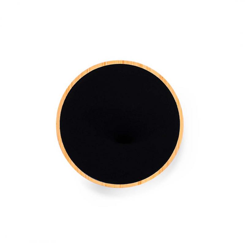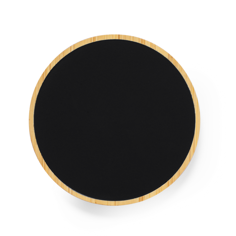 Cargador inalámbrico circular. Fabricado en bambú, con superficie en elegante color negro. Luz led interior y recubrimiento exterior especialmente diseñado para marcaje en láser, iluminando así el logotipo. Con función carga de 15W, compatible con dispositivos equipados con tecnología de carga inalámbrica Qi. Con base antideslizante, incluye cable cargador Tipo C y manual de instrucciones en español e inglés. Presentado en caja individual de diseño kraft.