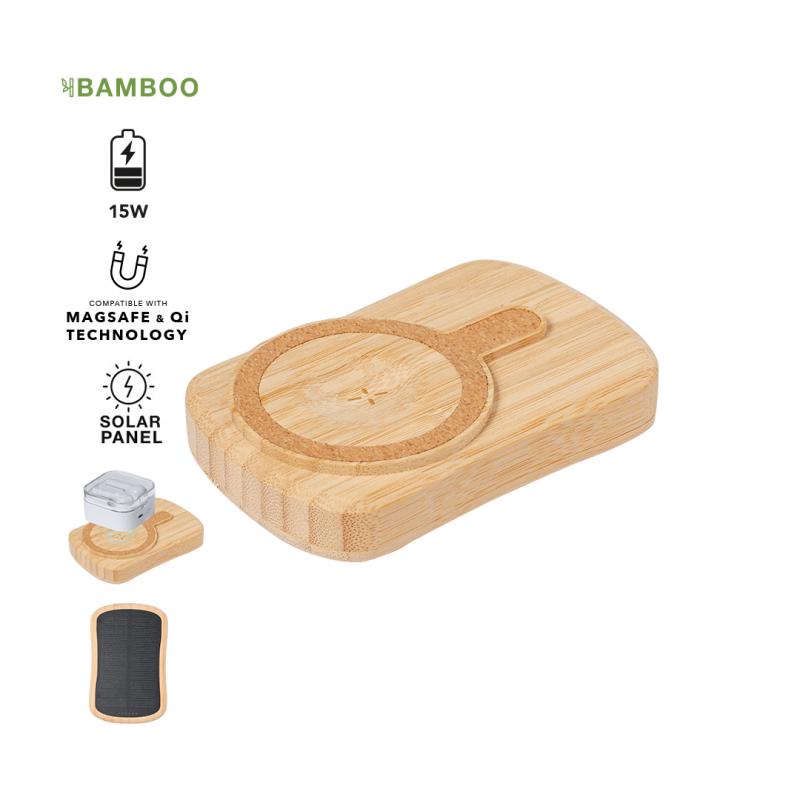 Batería auxiliar externa de recarga solar fabricada en bambú. Con 5.000 mAh de capacidad de cargada y cargador inalámbrico integrado de 15W. Salida y entradas Tipo C -cable incluido-, e indicador de estado de carga. Compatible con dispositivos equipados con tecnología de carga inalámbrica. Con panel solar integrado en un lado del dispositivo y amplia superficie de marcaje. Presentado en atractiva caja de diseño eco. Las capacidades mostradas en todas nuestras baterías auxiliares externas son reales, incorporando todas ellas baterías de grado A y no recicladas, con una vida útil de al menos 500 ciclos de carga y según normativa CE.Además, están fabricadas conforme a los estándares RoHS y en cumplimiento con los siguientes requisitos de seguridad:Sistema de protección contra sobrecarga del power bank.Sistema de protección contra descarga completa que proporciona una mayor durabilidad del power bank.Sistema de bloqueo para evitar cortocircuitos.Sistema de transferencia de carga constante, acorde con la capacidad del dispositivo de destino.