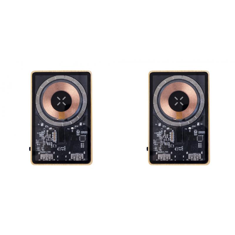 Batería auxiliar externa de original diseño y superficie transparente que permite ver los componentes internos del dispositivo. 5.000 mAh de capacidad de carga, con base en bambú y cargador inalámbrico integrado 15W. Conexiones de entrada/salida Tipo C + salida USB. Fijación magnética Magsafe y compatible con dispositivos equipados con tecnología de carga inalámbrica Qi. Cable de carga incluido, con manual de instrucciones en español e inglés. Presentada en caja individual de diseño eco y en cartón kraft.Entrada/Salida Tipo C: 5-12V DC 3-1.67A, 20WSalida USB: 5-12V DC 3-1.5A, 18WLas capacidades mostradas en todas nuestras baterías auxiliares externas son reales, incorporando todas ellas baterías de grado A y no recicladas, con una vida útil de al menos 500 ciclos de carga y según normativa CE. Además, están fabricadas conforme a los estándares RoHS y en cumplimiento con los siguientes requisitos de seguridad:Sistema de protección contra sobrecarga del power bank.Sistema de protección contra descarga completa que proporciona una mayor durabilidad del power bank.Sistema de bloqueo para evitar cortocircuitos.Sistema de transferencia de carga constante, acorde con la capacidad del dispositivo de destino.Materiales como el bambú fomentan la utilización de materias primas naturales, reduciendo las emisiones contaminantes. Proviene de una planta de gran resistencia y versatilidad, con crecimiento y regeneración rápidos, siendo una excelente alternativa al uso de madera tradicional.