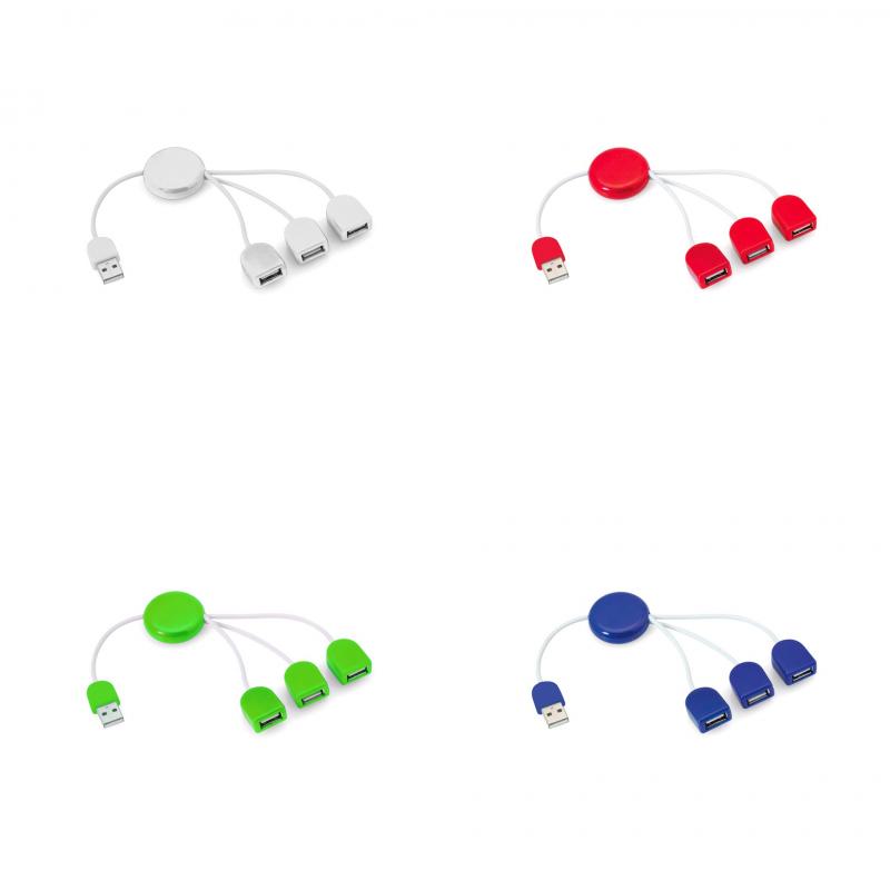 Puerto USB 2.0 en vivos colores con accesorios a juego. Con 3 puertos USB y pastilla circular lisa para marcaje. Presentado en caja individual negra.