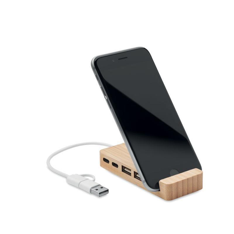 Hub USB-C/A de 4 puertos en estuche de bambú. Salida: 2 x Tipo-A y 2 x Tipo-C. Entrada: 2 en 1 Tipo-C y Tipo-A. Longitud del cable: 20 cm.Recipiente :
