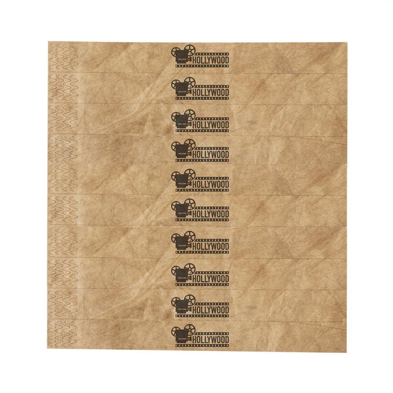 Pulsera para eventos de acabado nature. Fabricada en fibra sintética Tyvek®, que destaca especialmente por su resistencia, flexibilidad, durabilidad y facilidad para la impresión. Con cierre adhesivo, talla única para adulto. Resistente al agua. Presentada en plancha troquelada de 10 piezas con numeración individual.