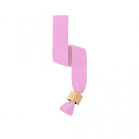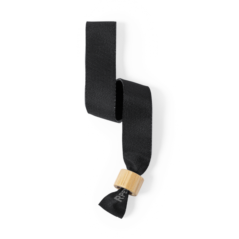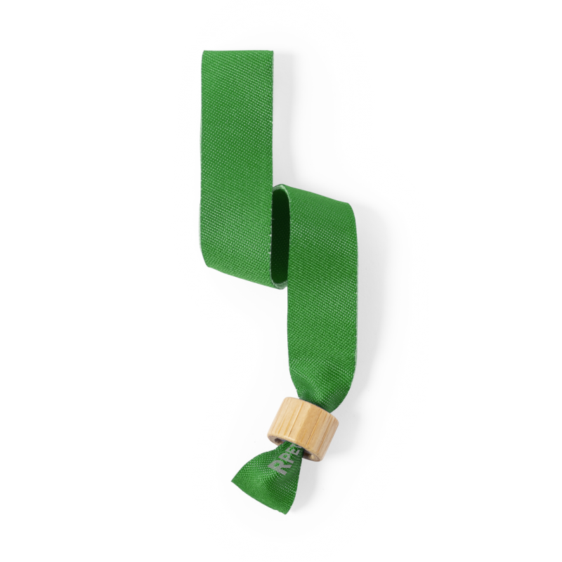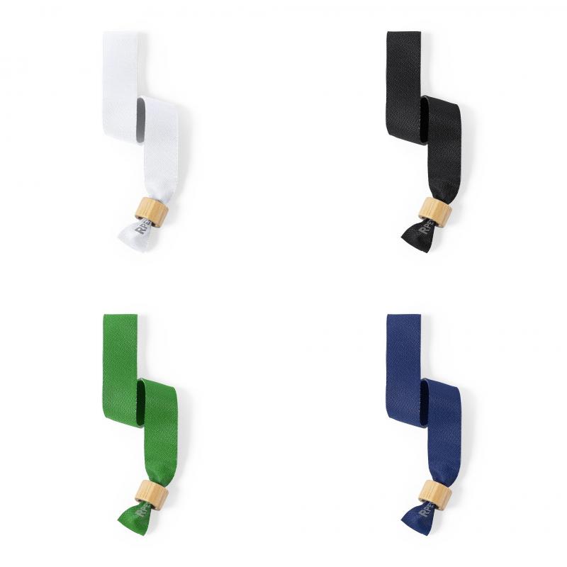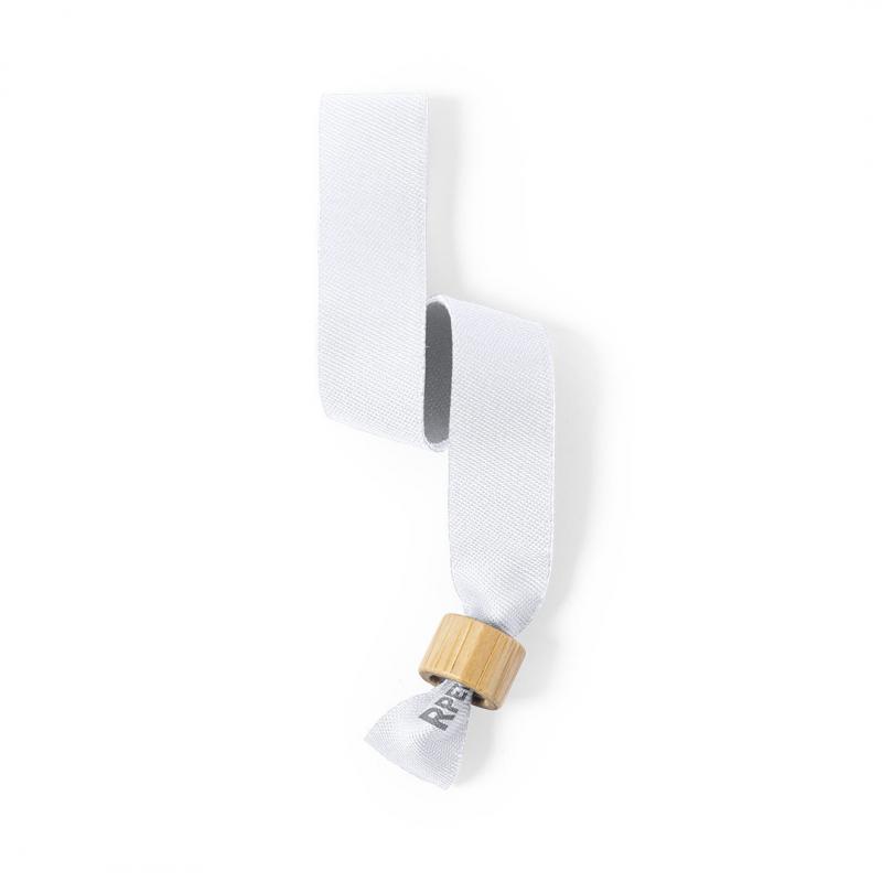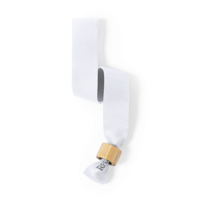 Pulsera para eventos de línea nature. Fabricada en poliéster RPET de 160g/m2, elaborado a partir de plástico reciclado para así fomentar la reutilización de residuos plásticos y contribuir a la sostenibilidad del planeta. Con ajustador en bambú y disponible en variada gama de colores, color blanco especialmente diseñado para sublimación. Distintivo RPET impreso en la pulsera.