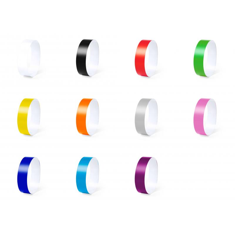 Pulsera para eventos en fibra sintética irrompible. Con cierre adhesivo de seguridad, resistente al agua y presentada en plancha troquelada de 10 piezas con numeración individual. En talla única para adulto y disponible en extensa gama de colores.