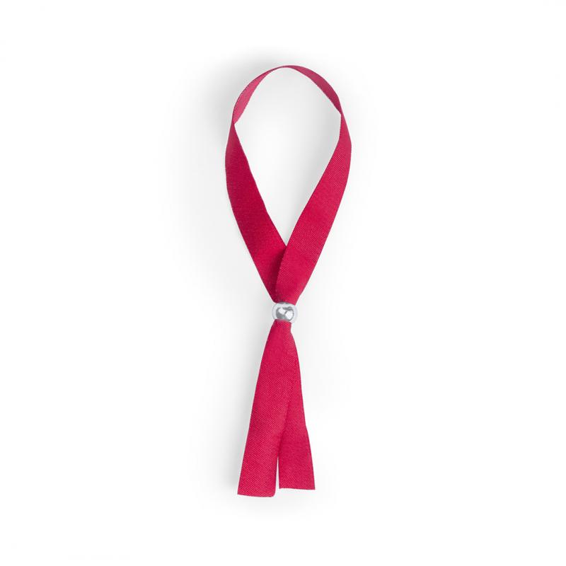 Pulsera ajustable en suave poliéster y amplia gama de colores. Con accesorio de ajuste en color plateado brillante.